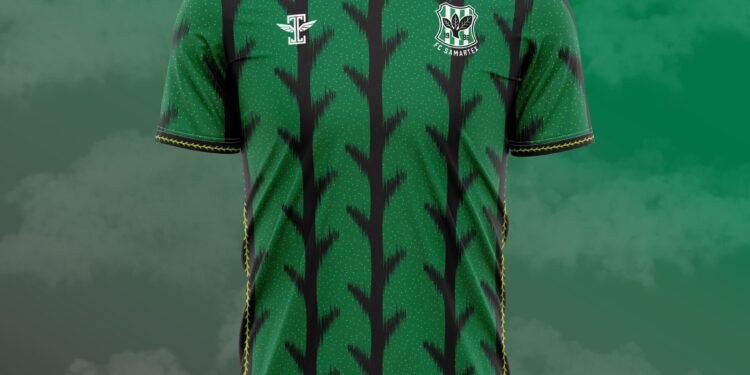 FC Samartex emphasized the importance of staying true to their roots within the design, and to reflect this, the club’s home kit incorporates a tree-like pattern atop a green and black colored jersey, in reference to their founding by workers at the Samartex Timber & Plywood Company. The club, also known as the TImber Giants, further honors its heritage through its orange and white kit, which displays the club’s name proudly across a backdrop of trees.