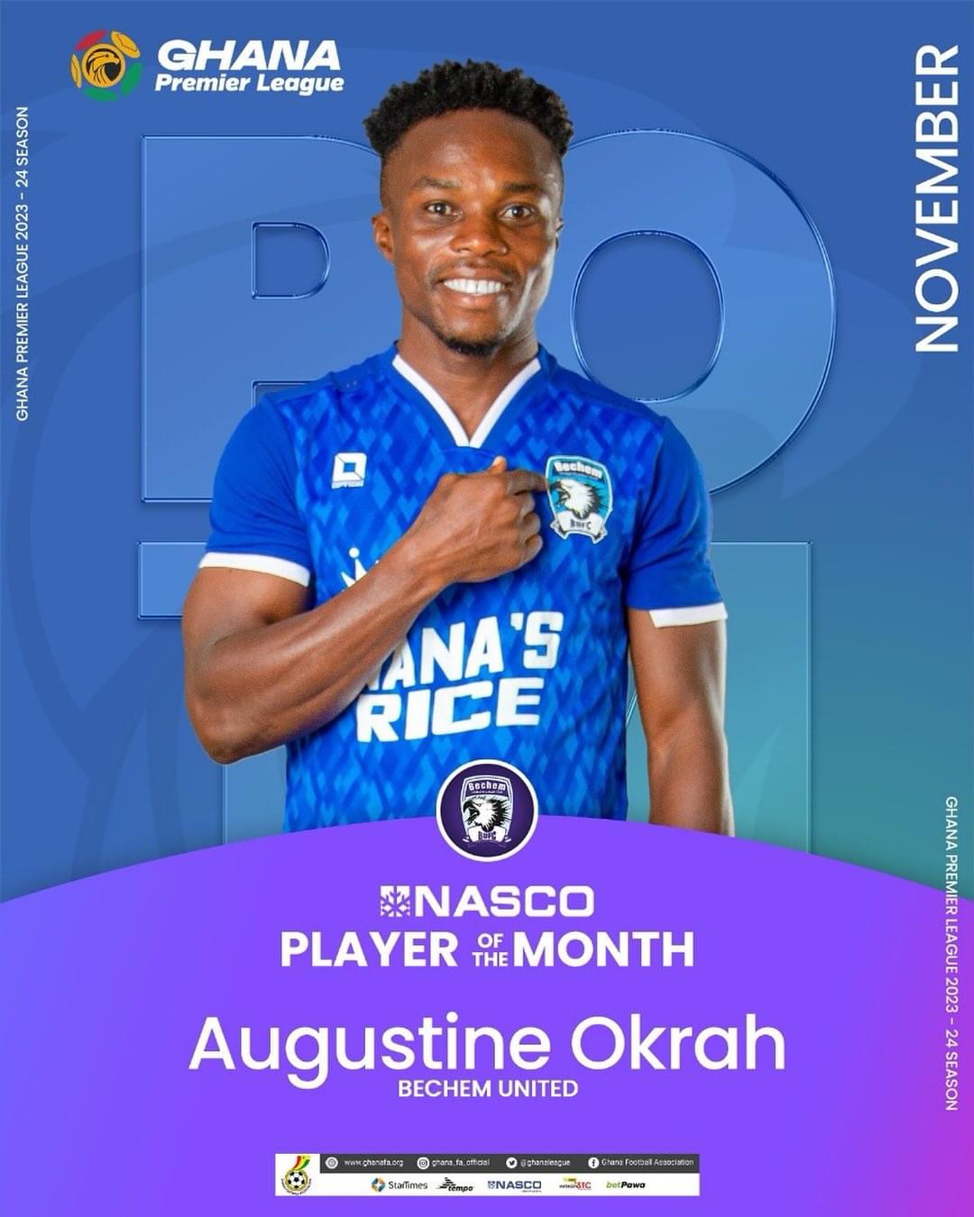 Bechem United midfielder Augustine Okrah has been adjudged as the NASCO Premier League player for the month of November.