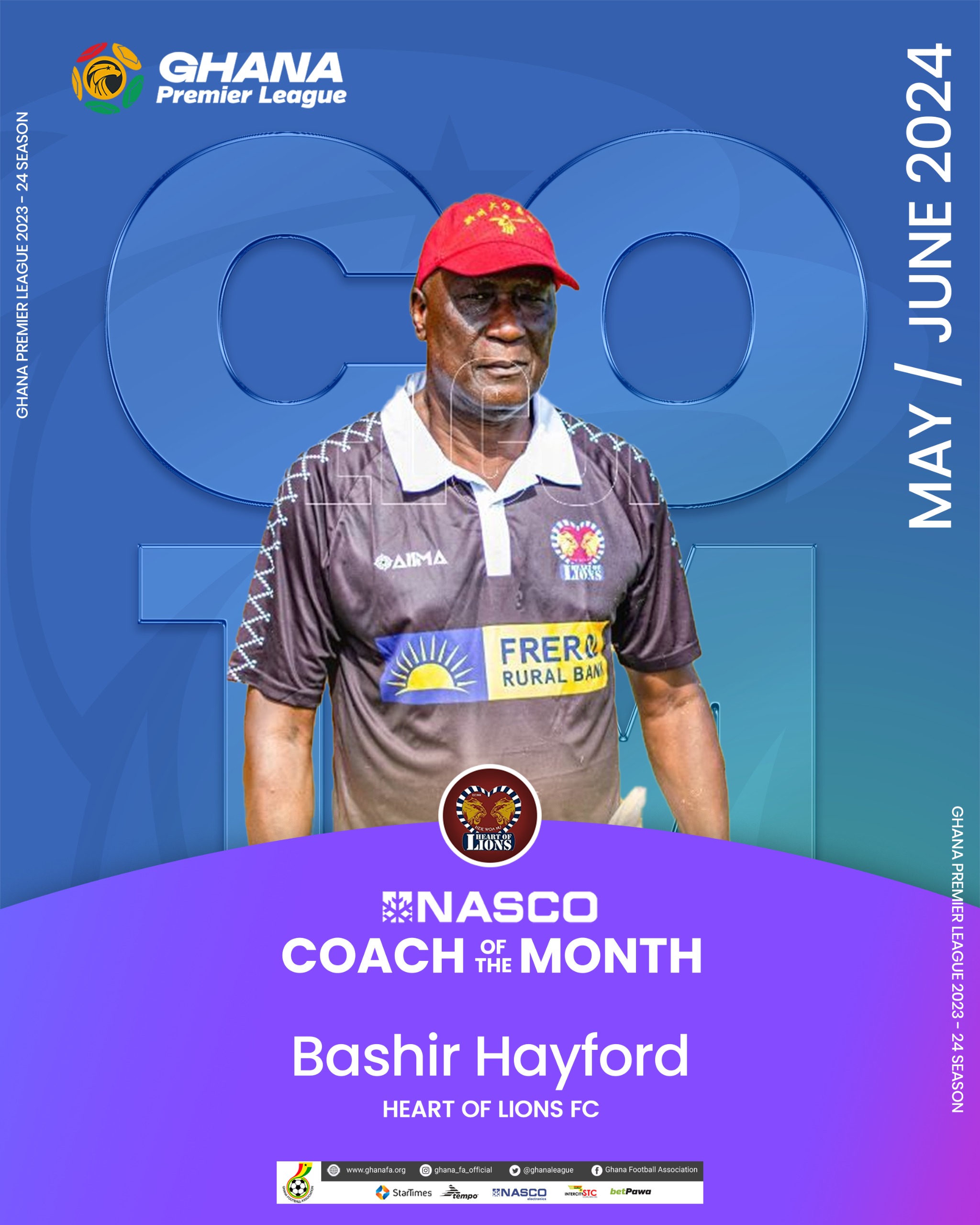 Bashir Hayford has won the NASCO Coach of the month for May/June 2024 after leading Heart of Lions to five wins and one draw in the last six matches of the Ghana Premier League.