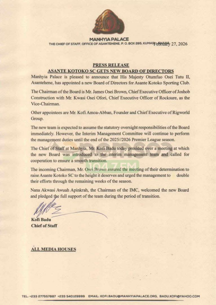 In a press release dated February 27, 2026, the Office of the Asantehene confirmed that His Majesty Otumfuo Osei Tutu II has constituted a new board to oversee the affairs of the club.