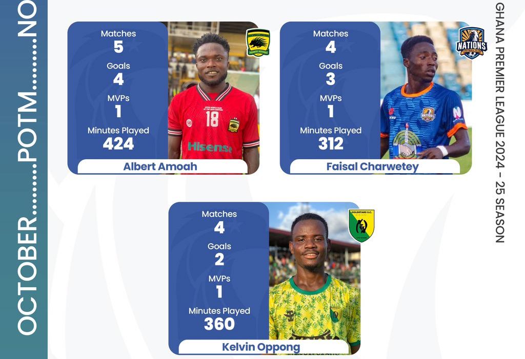 - Albert Amoah (Asante Kotoko SC): With 4 goals in 5 matches, Amoah is the joint top scorer in the Premier League. He played 424 minutes and earned 1 NASCO Player of the Match award.