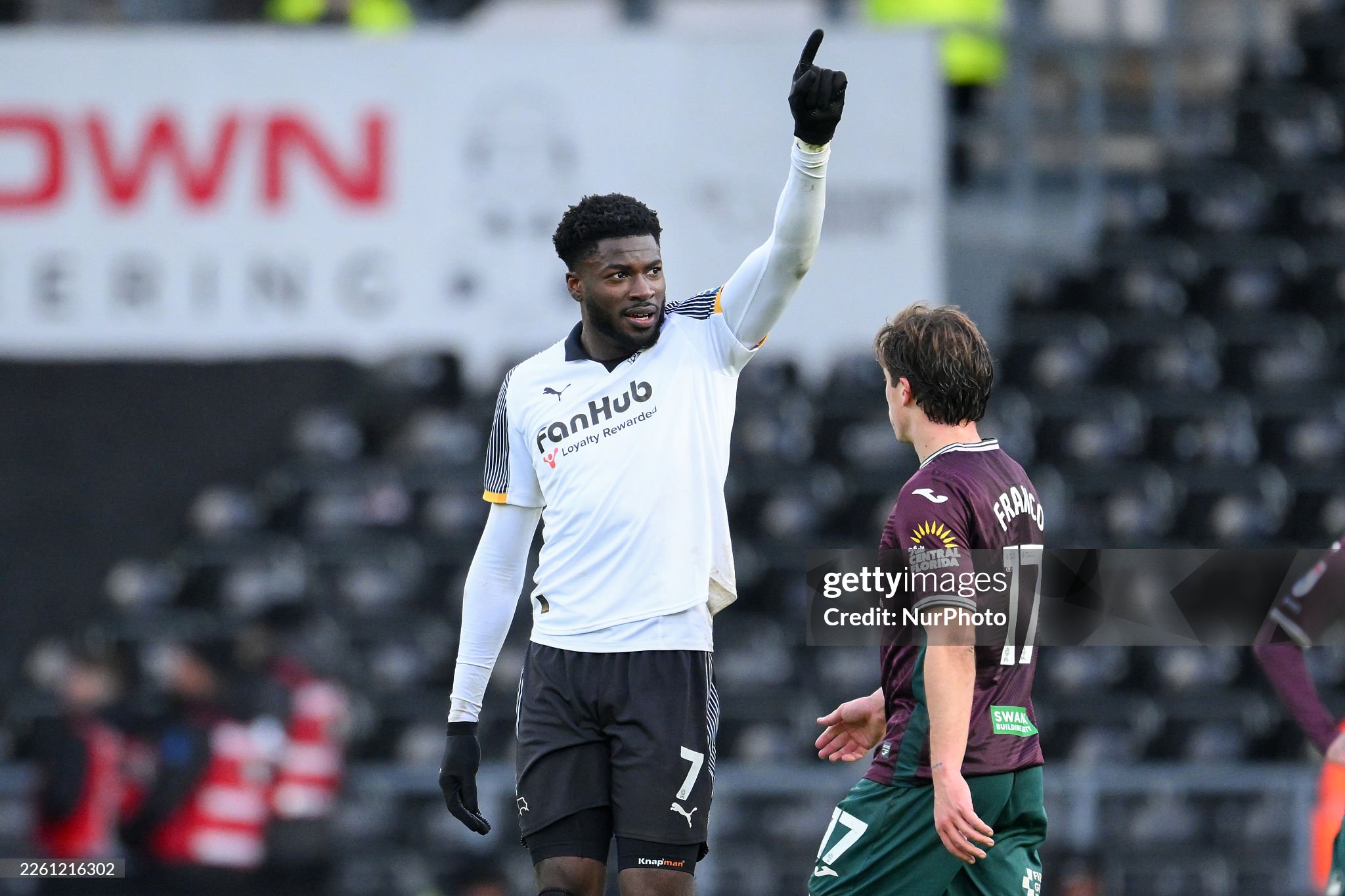 Patrick Agyemang of Derby County celebrates after scoring a goal to make it 2-0 during the Sky Bet Championship Fourth Round match between Derby County and Swansea City at the Pride Park in Derby, on February 14, 2026. (Photo by Jon Hobley/MI News/NurPhoto via Getty Images)