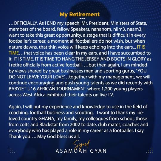 Gyan, former Black Stars captain on Tuesday 20th June, 2023 declared his retirement from football.