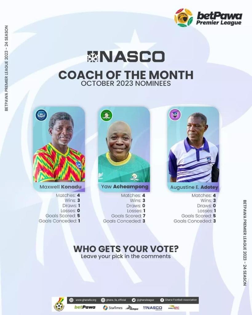 Maxwell Konadu, Yaw Acheampong and Evans Adotey up for coach of the month award