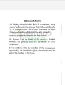 In an official statement, it was confirmed that the management’s mandate also came to an end simultaneously with the board. The communication from Manhyia, the seat of the Asante Kingdom, was conveyed to the board when they presented their report on Tuesday, July 18, 2023.
